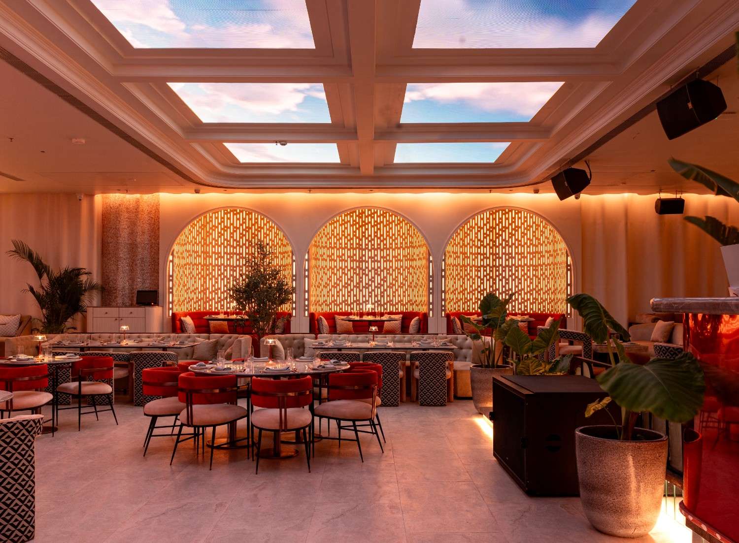 Dynamic LED skylight ceiling that transforms with daylight—warm sunlit glows by day, starlit canopy by night. Sculpted arches, private cabanas, and an immersive setting for every occasion.